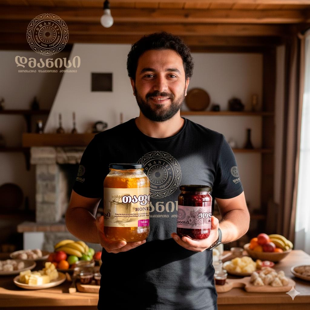 We proudly present local honey from the beautiful and hospitable Dmanisi region, located in the Lesser Caucasus Mountains. Our honey is harvested in ecologically pristine areas, at an altitude of 1,000–1,500 meters above sea level, and is rich in the aromas of acacia, elderberry, linden, licorice and mountain herbs. We also produce honey candles in various sizes and shapes, as well as propolis, which is used in medicine as an antimicrobial agent.