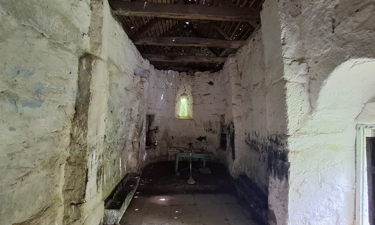 In the semi-circular apse of the sanctuary, two-tiered niches are arranged on both sides of the window. The longitudinal walls of the nave are articulated by two-stepped pilasters. From the first stage of the pilasters, wall arches are carried eastwards and westwards. The arches of the longitudinal walls and the western wall rest on corner pilasters. The church has an architraved doorway located at the centre of the southern wall. The interior space was illuminated by one arched window pierced in each wall (except the northern wall).